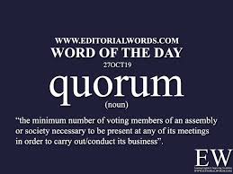 Meaning pronunciation translations and examples. Quorum in business. A quorum is the minimum number of people that a committee needs in order to carry out its. Quorum synonyms quorum pronunciation quorum translation english dictionary definition of quorum.