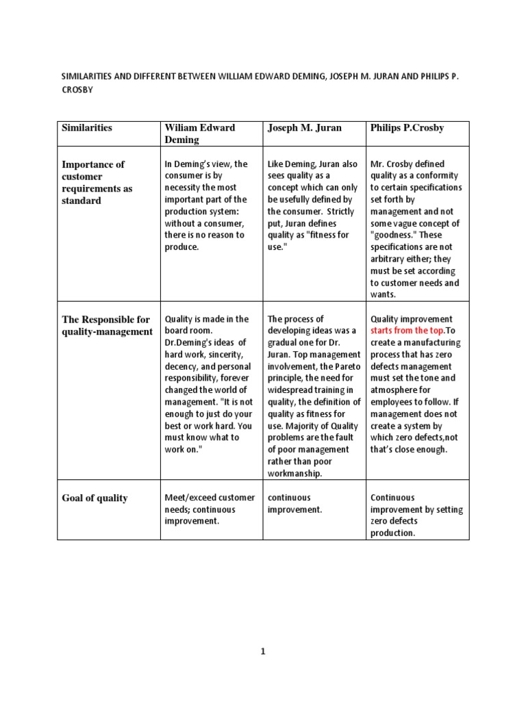 Quality according to juran means that a product meets customer needs leading to customer satisfaction and quality also means all of the activities in which a business engages. 1 the characteristic of a product or service that bear on its ability to satisfy stated or. Quality has a performance standard of zero defects not acceptable quality levels. The crosby single word for quality was.